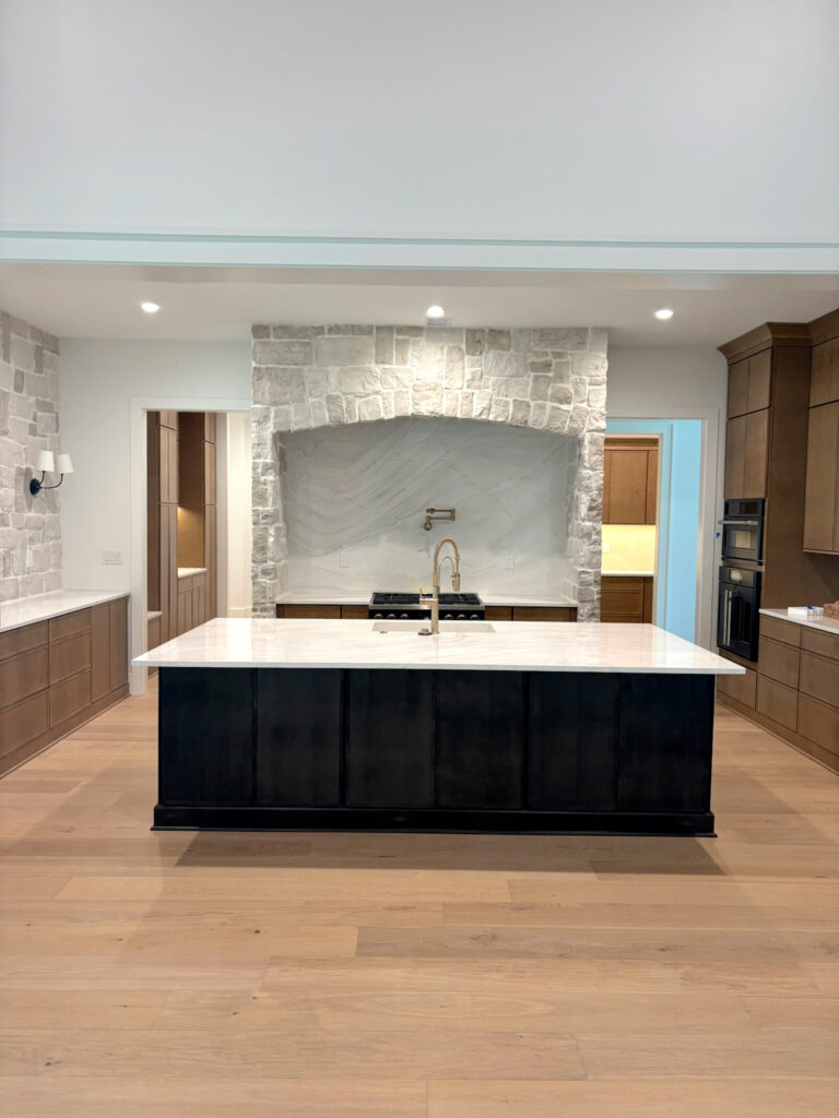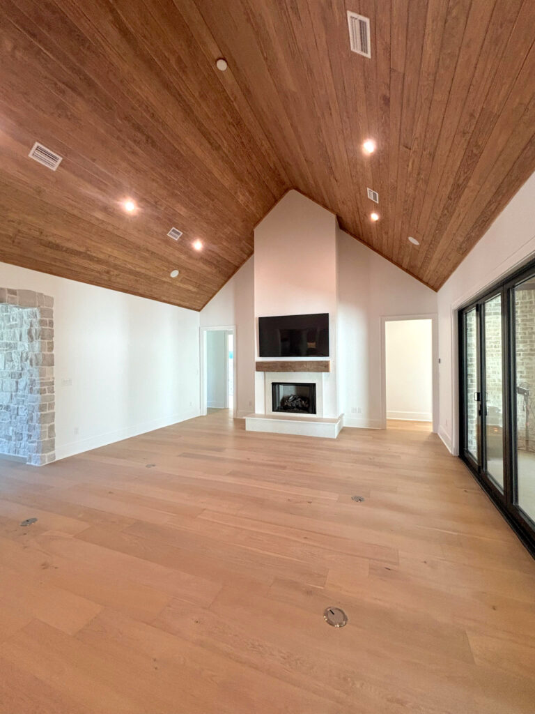 The exterior combines a steep roofline, a dramatic gable, and elegant transitions of brick and stone for a commanding presence. A side-facing three-car garage keeps the front façade pristine. Inside, the open-concept living and kitchen area flows into a huge covered patio with a fireplace, perfect for outdoor entertaining. A dedicated dining room, sunroom with vaulted ceilings, and a master suite with a spa-like bath and closet offer both style and comfort.